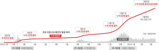 국내 코로나19 누적 확진자가 10만명이 되는 데 걸린 시간은 총 430일. 다른 주요 국가들에 비하면 피해가 그나마 적은 상황이다.