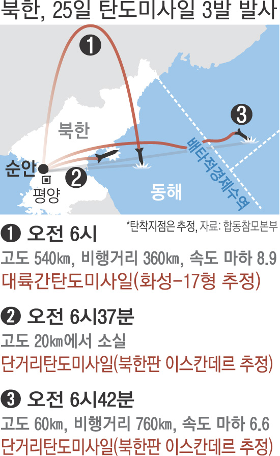북한이 25일 대륙간탄도미사일(ICBM)을 포함한 탄도미사일 3발을 발사한 것은 ‘의도된 타이밍’이라는 분석이 나온다.