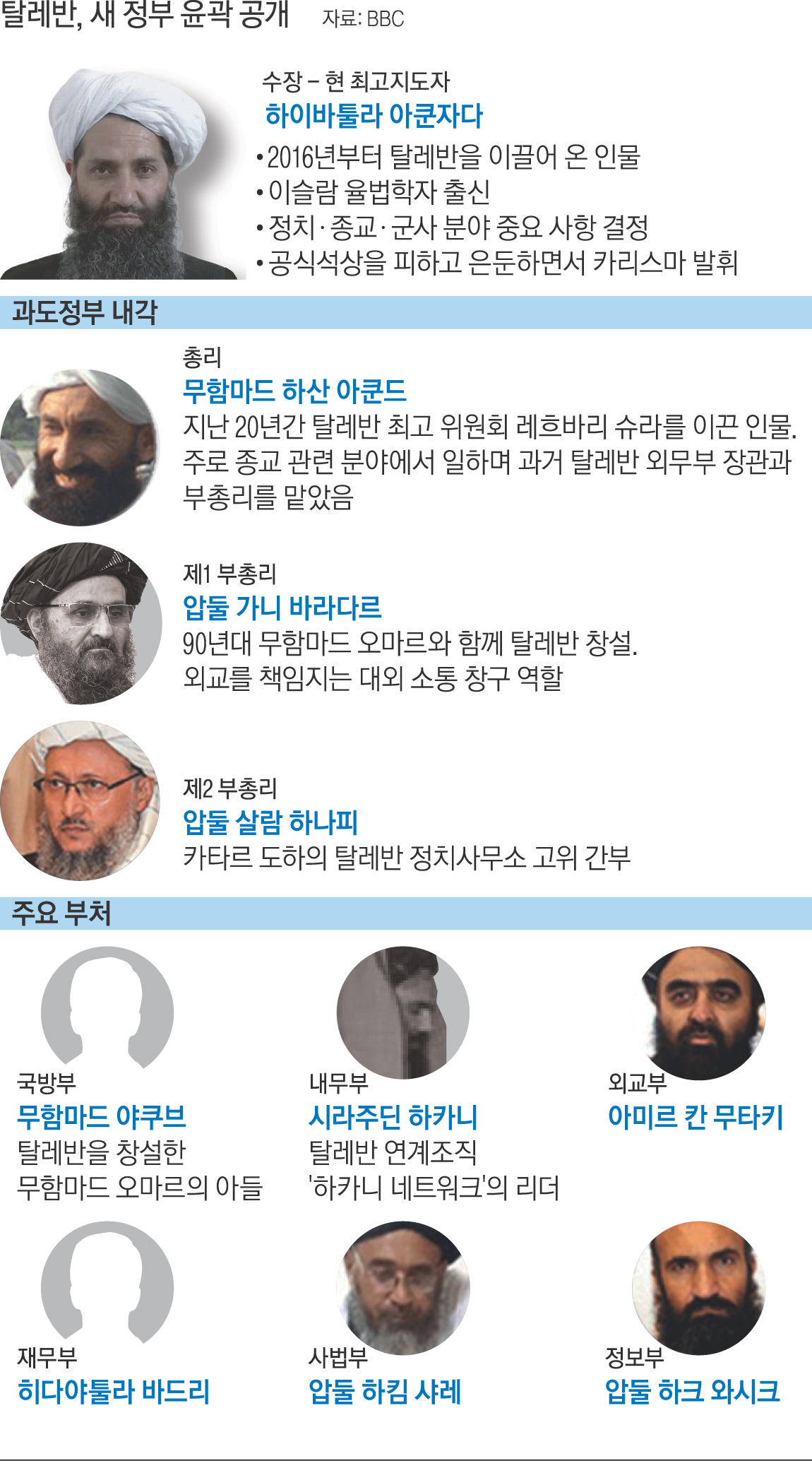 아프가니스탄을 무력 탈환한 탈레반이 무함마드 하산 아쿤드를 새 정부 총리 대행으로 한 내각 구성안을 발표했다.