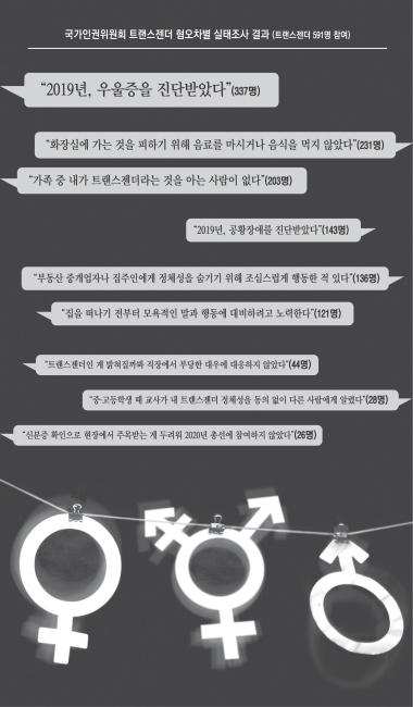 남과 여, 두 성으로만 사람을 구별하는 ‘홀수와 짝수의 세계’에서 트랜스젠더는 요람에서 무덤까지 생애주기마다 심각한 차별에 직면한다. 국가인권위원회가 9일 발표한 ‘트랜스젠더 혐오차별 실태조사’에서 응답자 554명 중 193명(34.8%)은 “일상적 용무를 포기한 적이 있다”고 답했다.