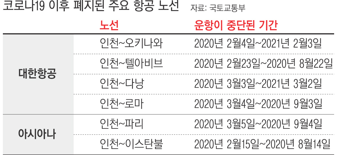 코로나19 사태로 인한 항공 수요 부족으로 자동 폐지된 국내 항공사의 국내 및 국제 노선이 약 300개에 달하는 것으로 확인됐다. 현행법은 일정 기간을 넘겨 운항이 재개되지 않으면 노선을 폐지하는데, 항공업계에선 코로나19와 같은 특수 재난 상황에 맞게 법 개정이 필요하다고 지적한다.