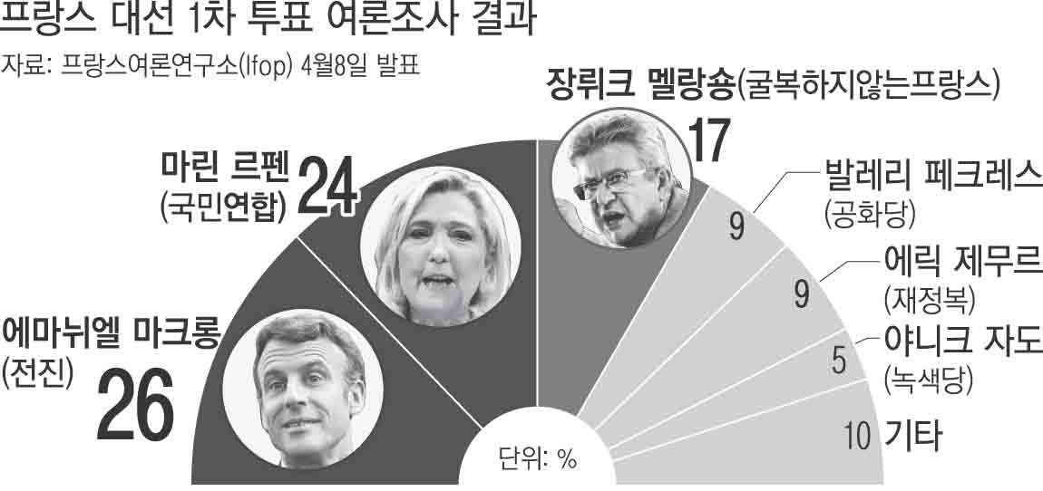 반면 젊은층을 중심으로 커지고 있는 르펜 후보와 그보다 더 극우로 분류되는 에릭 제무르 후보에 대한 지지는 이번 선거의 핵심 변수가 될 것으로 예상된다.