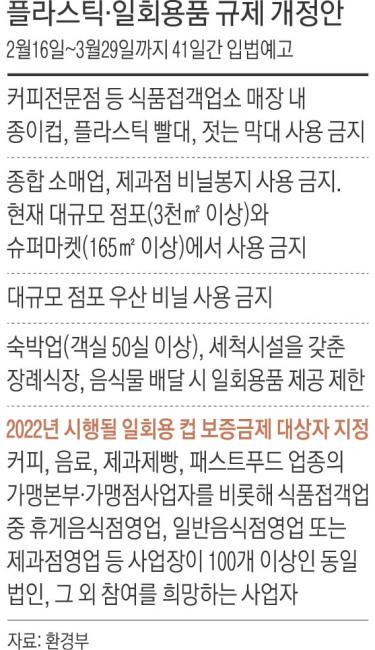 개정안에는 일회용품 규제를 크게 강화하는 내용이 담겼다. 커피전문점, 식당 등 식품접객업소 매장에서 종이컵과 플라스틱으로 만든 빨래·젓는 막대 사용이 금지된다. 이들 매장 내 플라스틱 컵 사용 금지 조치는 이미 시행 중이지만 코로나19 방역조치 일환으로 현재는 일시적으로 사용이 허용되고 있다.