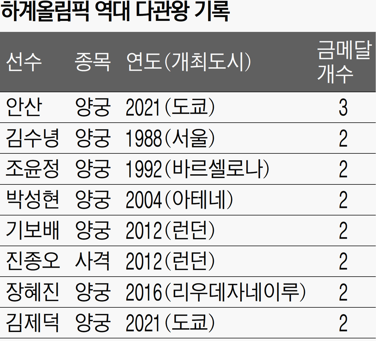 안산은 30일 양궁 여자 개인 결승에서 슛오프 끝에 금메달을 따 양궁 사상 첫 3관왕에 올랐다.