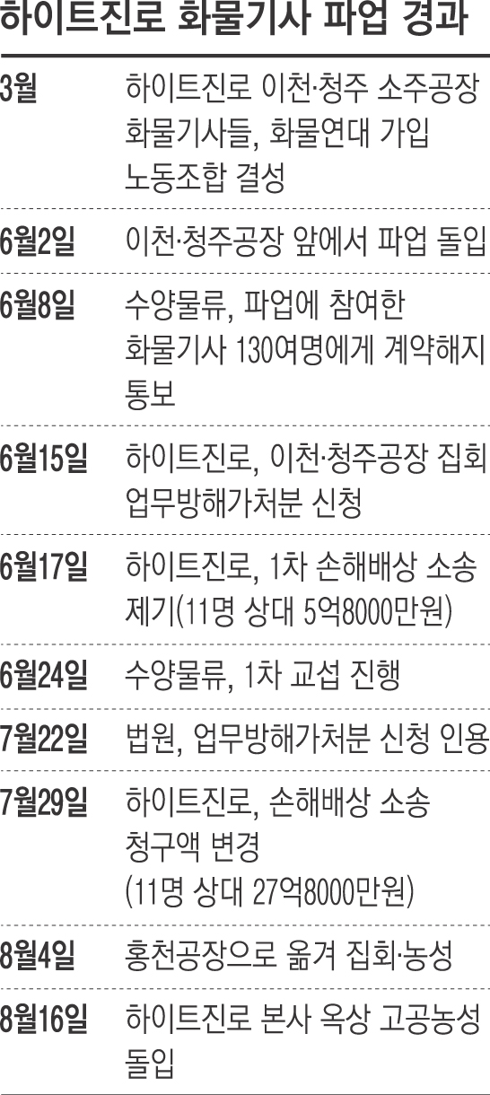 지난 5일. 홍천강을 따라 지나온 한적한 도로 끝. 늘어선 화물차들이 나타났다. 2차선 도로의 차선 하나를 가득 메웠다. 푹푹 찌는 아스팔트 위 화물차엔 거대한 맥주 광고가 붙었다. “리얼탄산 100% TERRA.” 화물차 주변으론 경찰차가 뒤섞였다. 더운 바람이 불었다. 화물차에 붙은 “하이트진로는 운송료를 인상하라” 현수막이 펄럭였다. 하이트진로 화물기사들이 파업을 시작한 지 65일째 되는 날이었다.
