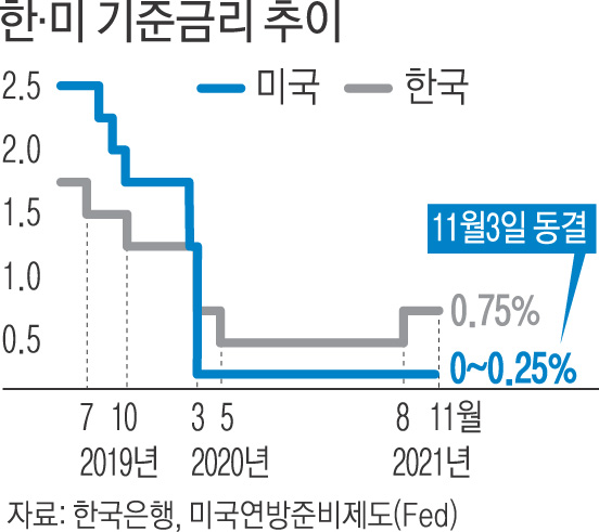 미국 중앙은행인 연방준비제도(Fed·연준)가 연내 자산 매입 축소(테이퍼링)를 시작한다고 발표했지만, 현재 제로 수준인 기준금리(0.00∼0.25%)를 올리는 것은 빨라야 내년 말이 될 것으로 금융권은 분석한다.