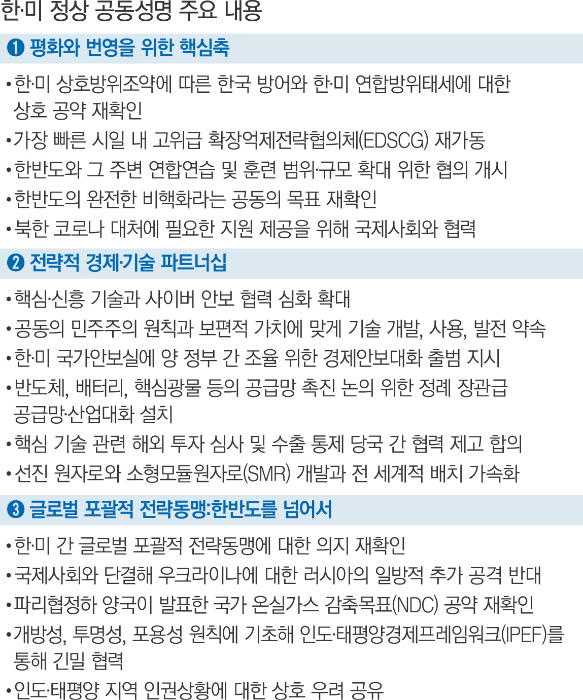 한·미 동맹을 ‘글로벌 포괄적 전략동맹’으로 규정하고, 윤 대통령이 한국의 인도·태평양경제프레임워크(IPEF) 참여 의사를 밝히는 등 미·중 패권 다툼 가운데 한·미 밀착 메시지 또한 분명히 했다.