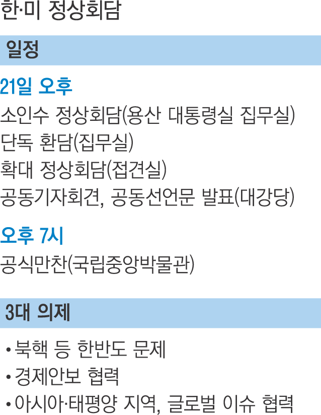 역대 정부 중 가장 이른 시일 내에 열리는 것으로 두 정상은 한반도 안보와 경제, 글로벌 이슈 협력 방안을 논의한다.