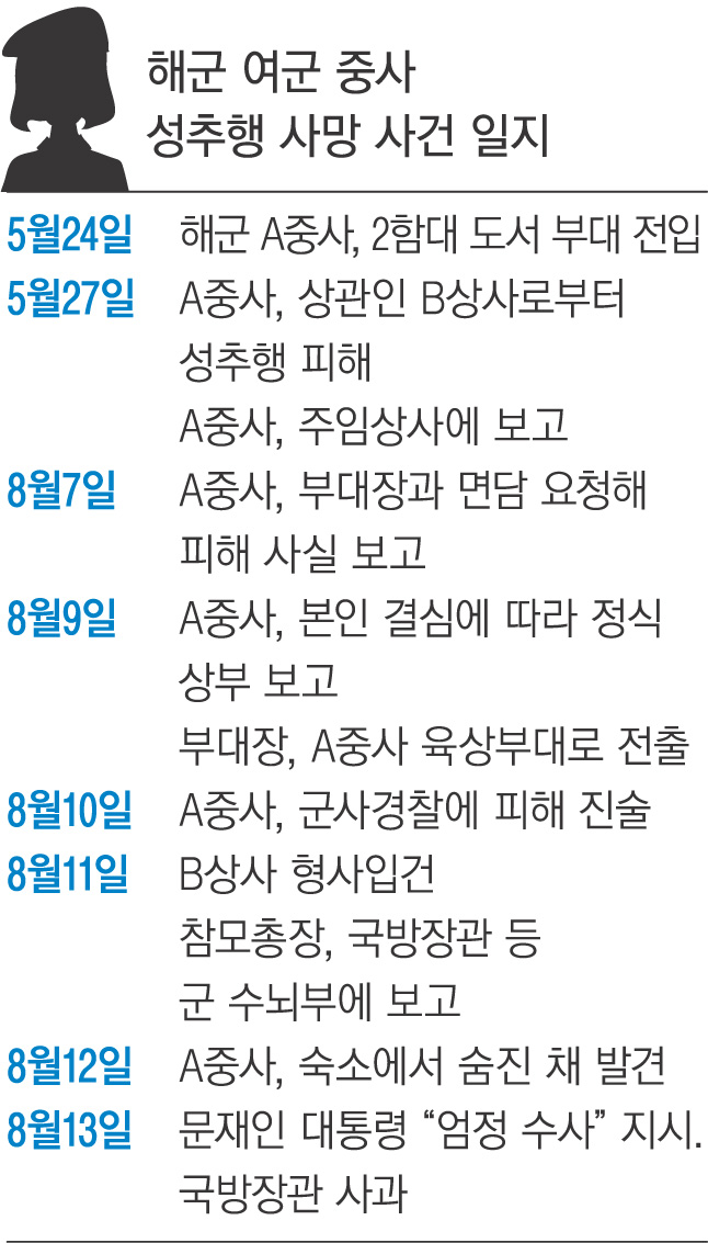 부대 상관에게 성추행을 당했다고 신고한 뒤 사망한 해군 여군 A중사는 사건이 일어난 부대 부임 사흘 만에 피해를 입은 것으로 확인됐다. A중사는 당일 상관에게 이를 알렸지만 군 수뇌부가 이 사건을 인지하기까지는 76일이나 걸렸다.