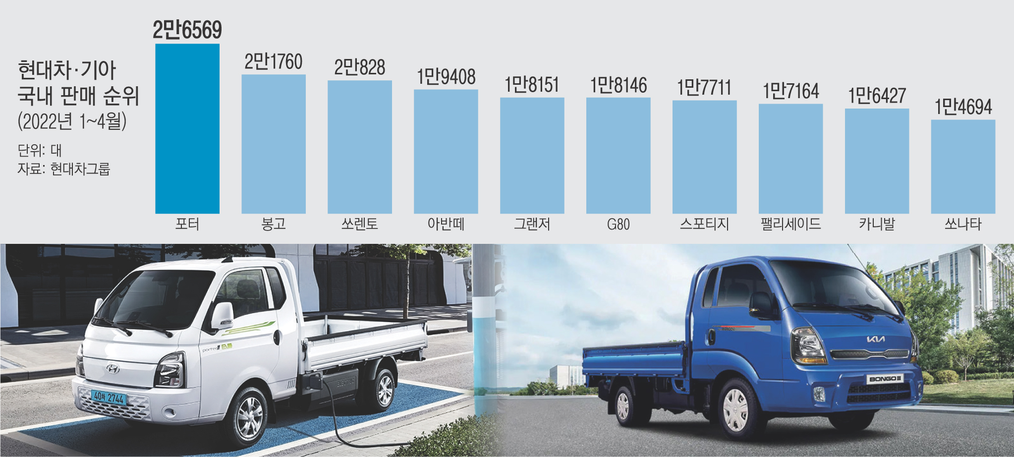 ‘자영업자의 발’로 불리는 1t 트럭 포터와 봉고가 올해 들어 현대차그룹 차종 가운데 내수 판매량 1~2위를 달리고 있는 것으로 나타났다.