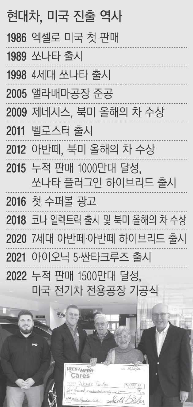 현대자동차가 미국 진출 36년 만에 누적 판매 1500만대(제네시스 브랜드 제외)를 달성했다.