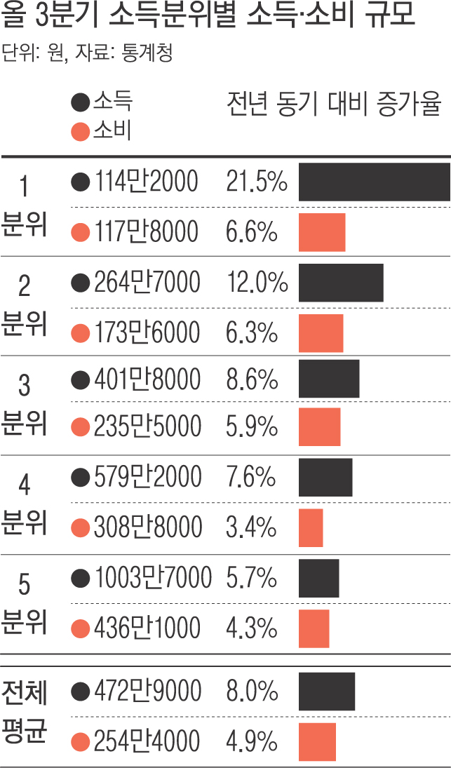 올 3분기 소득 하위 20%의 월소득이 역대 처음으로 100만원대를 돌파했다.