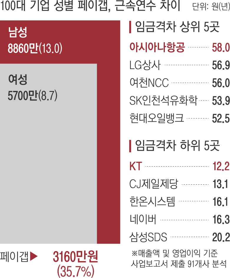 [유리천장 박살 프로젝트]대기업 여성 노동자, 남성보다 연봉 3160만원 덜 받고 근속연수도 4.3년 짧아