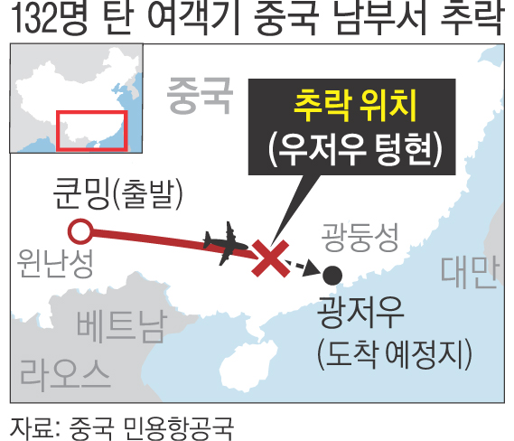 중국 민항국은 보도 이후 이날 오후 1시15분(현지시간) 윈난(雲南)성 쿤밍(昆明)을 출발해 광둥(廣東)성 광저우(廣州)로 가던 동방항공 MU5735편이 우저우 상공에서 통신이 두절된 뒤 추락한 것으로 확인됐다고 밝혔다.