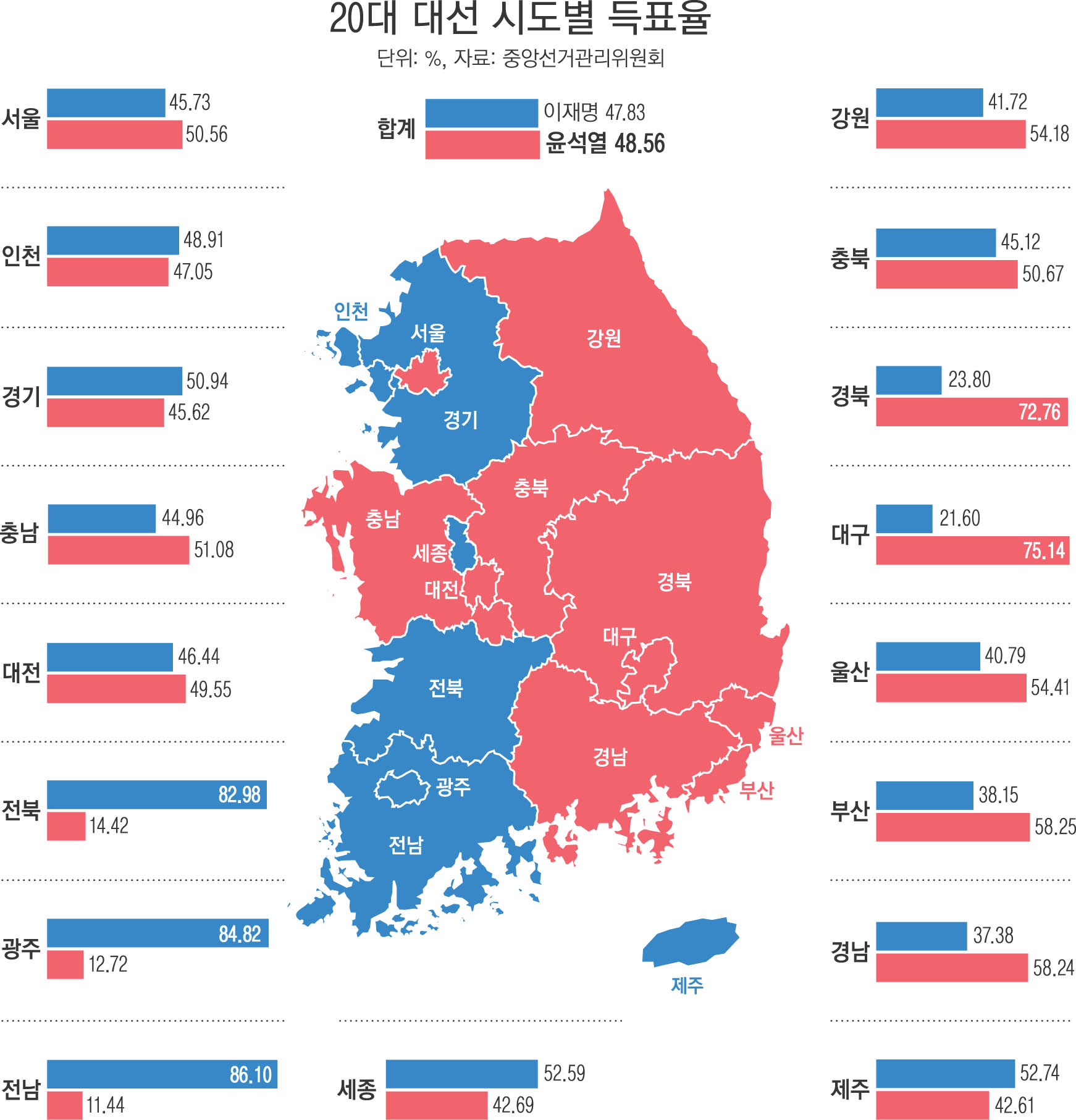 20대 대통령 선거 개표 결과를 살펴보면 민심의 미묘한 변화가 눈에 띈다.