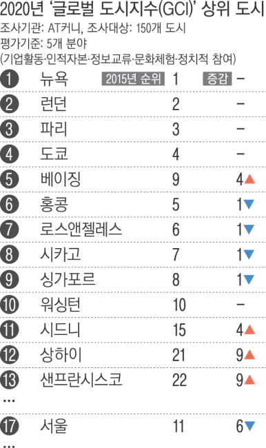 전 세계 주요 도시들의 경쟁력을 비교한 지수에서 서울의 순위가 최근 5년 사이 큰 폭으로 하락한 것으로 나타났다. 현시점에서 경쟁력이 떨어지는 것은 물론 미래의 성장 잠재력 평가에서는 더 큰 폭의 하락을 보였다.