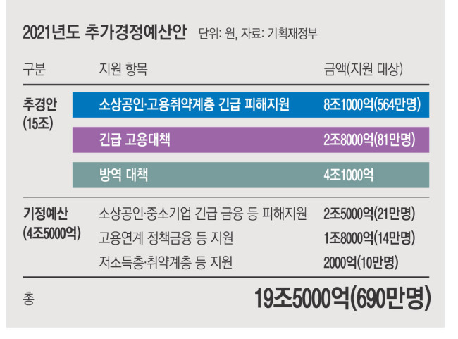 정부가 2일 국무회의에서 의결한 19조5000억원 규모의 4차 재난지원금이 코로나19로 피해를 입은 소상공인을 비롯한 690만명에게 최대 500만원씩 지급된다. 청년과 여성, 중·장년층을 위한 일자리 27만5000개도 만든다.