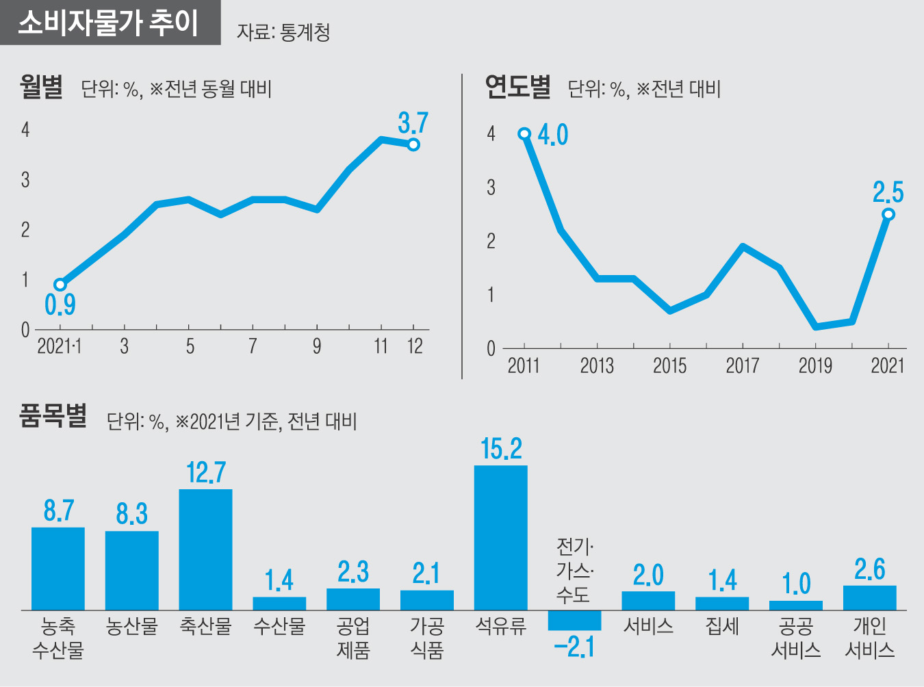 2021년 소비자물가가 전년보다 2.5% 올라 10년 만에 최고 상승폭을 기록했다.