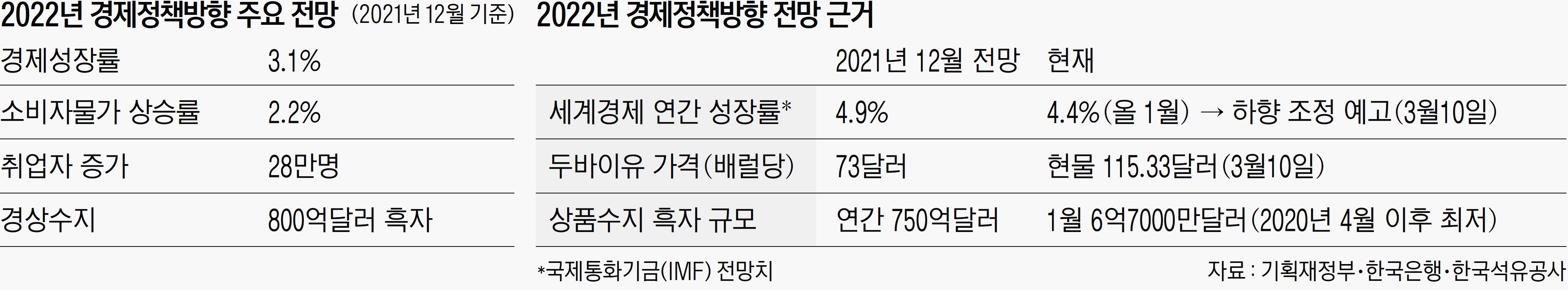 11일 기획재정부와 국제통화기금(IMF) 등에 따르면 기재부는 지난해 12월 발표한 ‘2022년 경제정책방향’에서 올해 경제성장률은 3.1%, 물가상승률은 2.2%로 전망했다.
