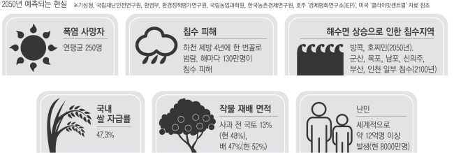 뉴욕 매거진의 칼럼니스트 데이비드 월리스웰스는 2050년 세계 약 50억명이 물부족 위기에 직면한다는 등 내용을 담아 <2050 거주불능 지구>를 썼다. 2050년이면 먼 미래가 아니다. 현재 10대는 40대가, 10세 미만은 30대가 되는 시점이다. 그때 한반도 상황은 어떨까. 최근까지 기후위기에 대한 국내외 연구를 종합해 2021년 10대인 가상의 인물 이준혁씨가 2050년 맞는 미래를 그려봤다.