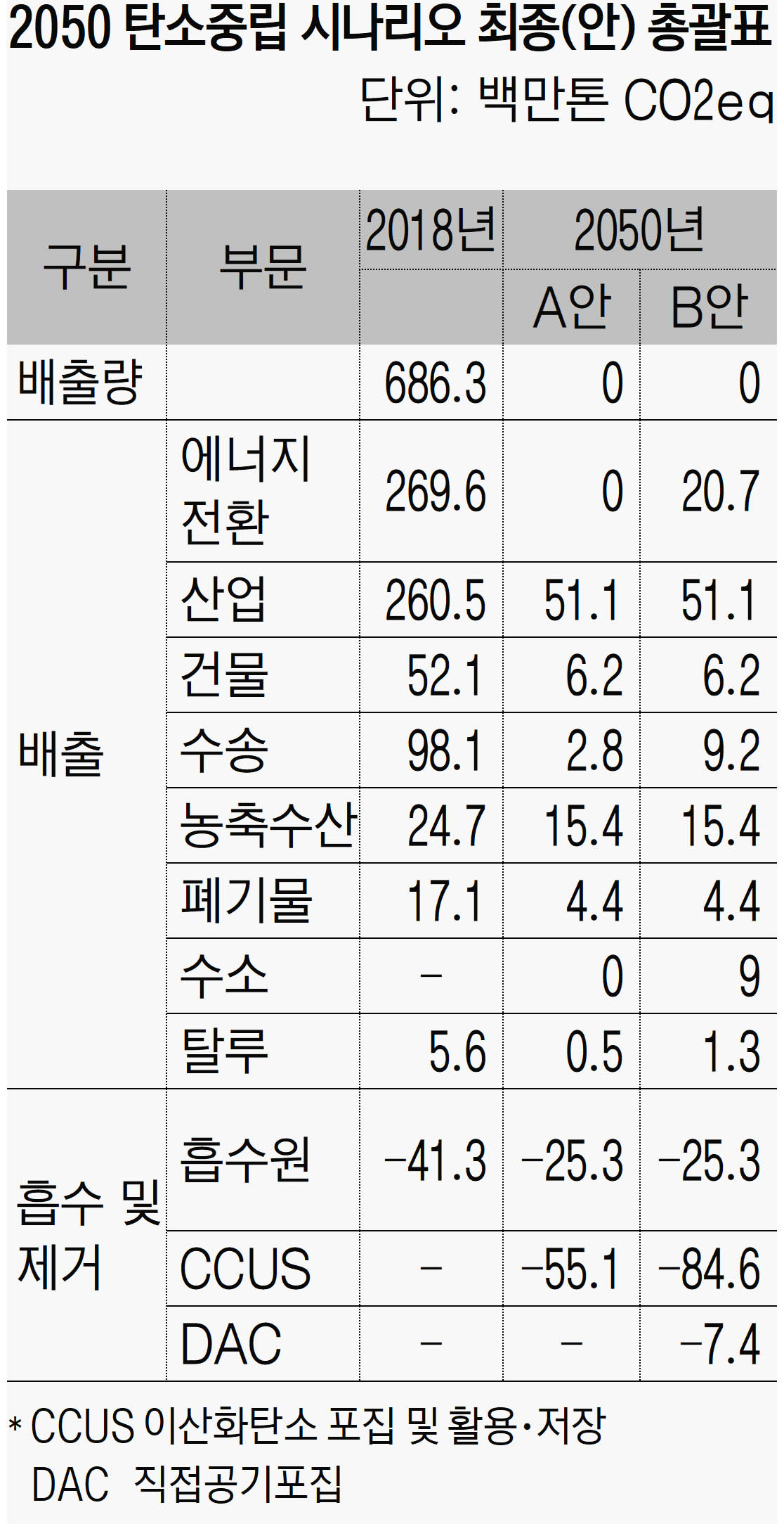 석탄과 액화천연가스(LNG) 등 화력발전소를 모두 폐쇄해 에너지 전환 부문의 온실가스 배출을 ‘0’으로 만드는 것(A안)과, 석탄발전소를 폐쇄하되 LNG발전은 일부 유지하는 것(B안) 두 가지다.