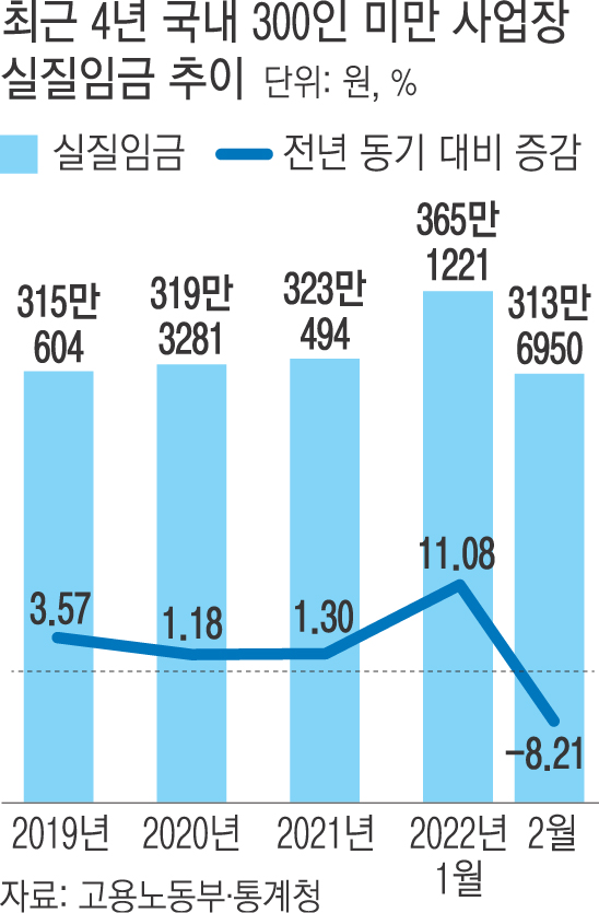 고용노동부가 공개하는 ‘고용노동통계’ 자료를 경향신문이 분석해 보니 2월 기준 300인 미만 사업장의 월평균 실질임금은 313만6950원으로 지난해 같은 달과 비교해 8.2% 줄었다.