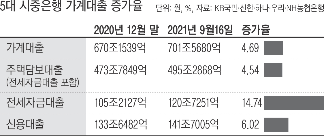 22일 KB국민·신한·우리·하나·NH농협 등 5대 시중은행의 자료를 종합하면 가계대출 잔액은 지난 16일 기준 701조5680억원으로 집계됐다.