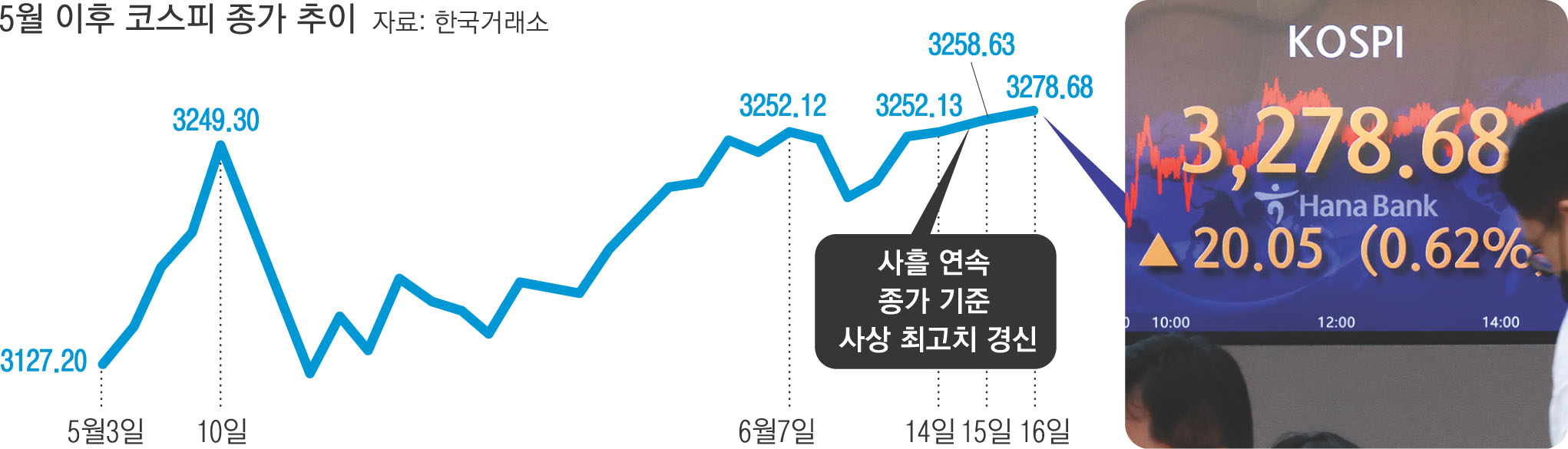 코스피가 사흘 연속 종가 기준 사상 최고치를 경신했다.