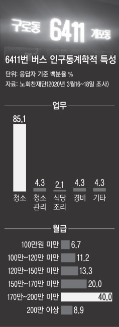 노회찬 전 정의당 의원은 생전에 해마다 3월8일이 되면 국회 청소노동자들에게 장미꽃을 건넸다. 노 전 의원은 2012년 “태어날 때부터 이름이 있지만 ‘아주머니’로 불리는 사람들이 있다”며 이들을 ‘투명인간’에 비유했다. 그러면서 투명인간들이 새벽마다 구로구에서 강남구로 가기 위해 6411번 버스를 탄다고 했다. 그로부터 9년이 지난 지금도 6411번 버스의 주 고객은 변함없이 중장년 여성 노동자들이다.