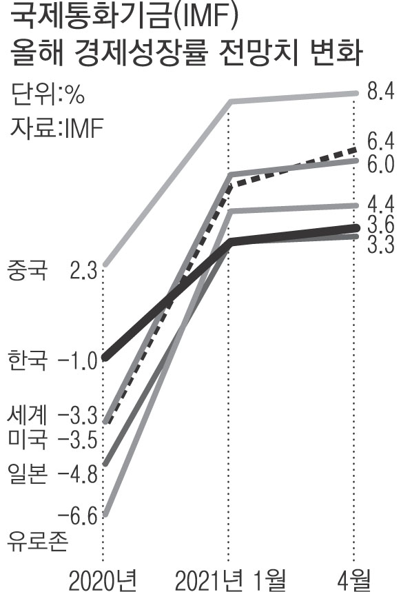 IMF는 6일(현지시간) 발표한 ‘2021년 4월 세계 경제전망’에서 올해 세계 경제성장률을 지난 1월 전망치(5.5%)보다 0.5%포인트 상승한 6%로 내다봤다. 한국의 올해 성장률 전망치는 3.6%로 1월보다 0.5%포인트 상향됐다.