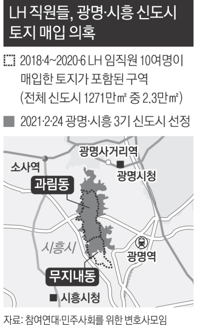 민주사회를위한변호사모임(민변)과 참여연대가 2일 공개한 한국토지주택공사(LH) 직원들의 광명·시흥 신도시 토지 사전 매입 정황은 공사 직원들이 업무상 얻은 미공개 정보를 활용해 부동산 투기에 뛰어들었을 가능성을 보여준다.