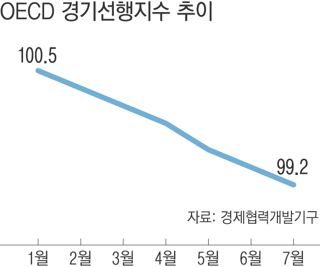 OECD 회원국의 경기선행지수는 올 7월 99.2로 4개월 연속 기준선인 100을 밑돌고 있다.