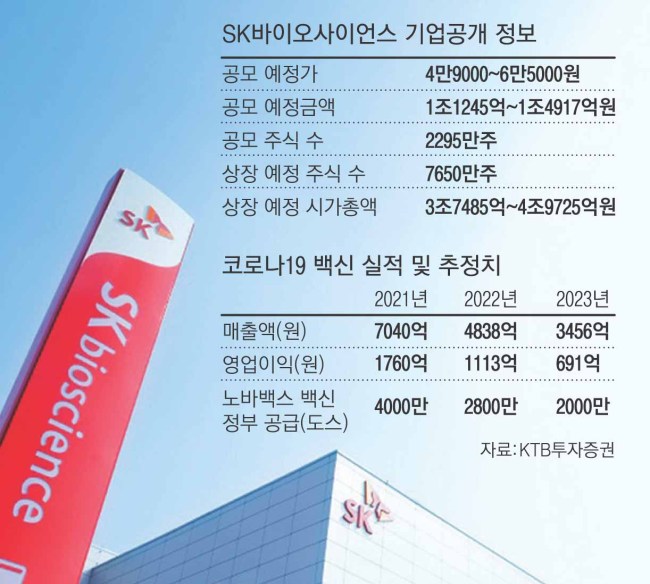 4일 SK바이오사이언스는 공모가 확정을 위한 기관투자가 수요예측을 시작했다. 희망 공모가는 4만9000~6만5000원, 공모금액은 최소 1조1245억~1조4917억원이다. 공모가 범위 기준으로 예상되는 상장 시 기업가치는 약 3조7485억~4조9725억원에 이른다.