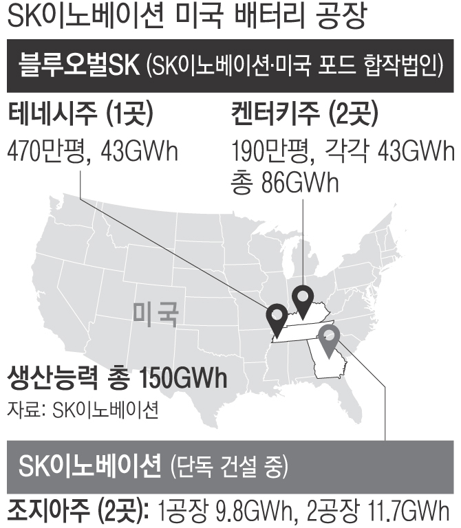 SK이노베이션은 포드와의 합작 법인 블루오벌SK를 통해 미국 내 배터리 생산공장을 건설하기 위해 두 업체가 각각 5조1000억원(총 10조2000억원)을 투자하기로 했다고 28일 밝혔다.