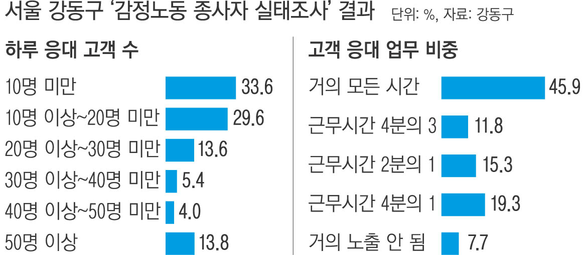 서울 강동구가 지난해 8~11월 관내 공공부문 감정노동자 405명을 대상으로 실태조사를 한 결과 감정노동자의 6%가 우울장애를 겪고 있는 것으로 나타났다.