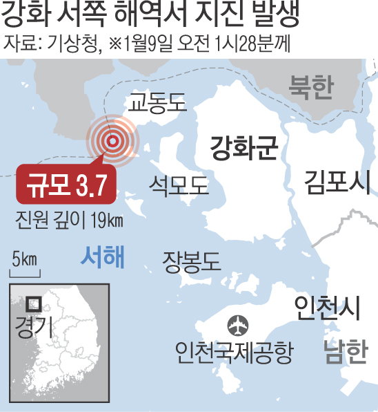 9일 새벽 1시28분쯤 인천 강화군 바다에서 규모 3.7의 지진이 발생했다.