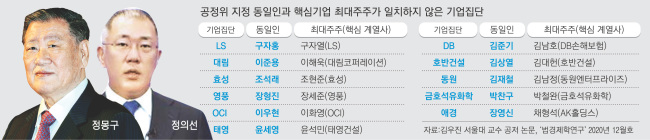현대자동차그룹 동일인을 정몽구 명예회장에서 정의선 회장으로 변경할지 여부를 두고 공정거래위원회가 고심에 빠졌다. 정 회장이 최근 인수·합병 등 주요 경영 현안은 물론, 조직 개편까지 주도하고 있지만 기존 동일인이 생존해 있는 상태에서 쉽사리 변경하는 것에 부담을 느끼기 때문이다. 다만, 여타 기업도 총수 3·4세로의 경영권 승계가 본격적으로 이뤄질 것으로 예상되는 만큼 권한과 책임을 일치하기 위해 동일인 제도를 전면적으로 손질해야 한다는 지적이 제기된다.