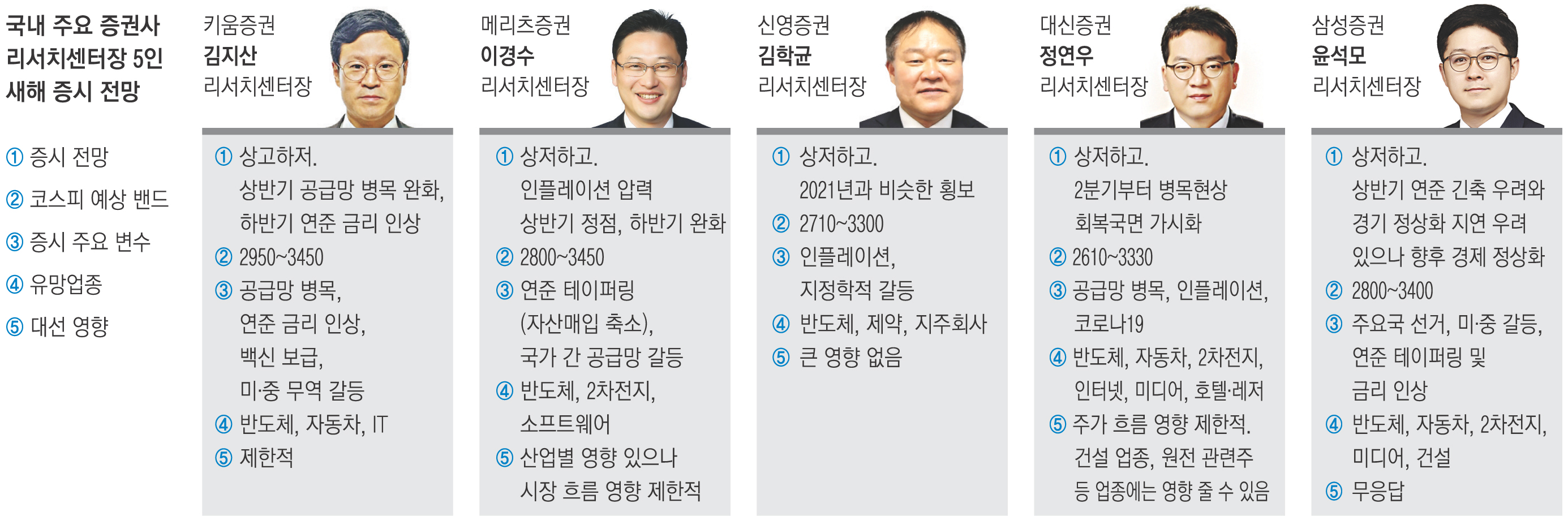 경향신문이 2일 대신증권, 메리츠증권, 삼성증권, 신영증권, 키움증권 등 국내 증권사 5곳의 리서치센터장들을 대상으로 2022년 증시 전망을 설문조사한 결과 올해 증시는 지난해 하반기와 비슷한 불확실성 속에서 박스권 장세를 이어갈 것으로 전망됐다.