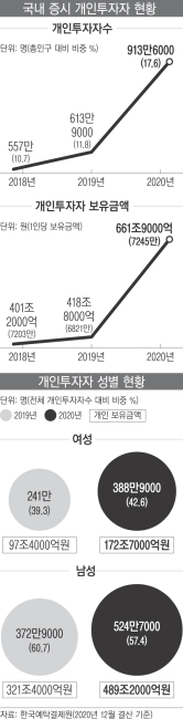동학개미 투자열풍이 거셌던 지난해 국내 개인투자자의 주식 보유금액이 전년 대비 58% 급증하며 660조원을 넘어선 것으로 집계됐다.