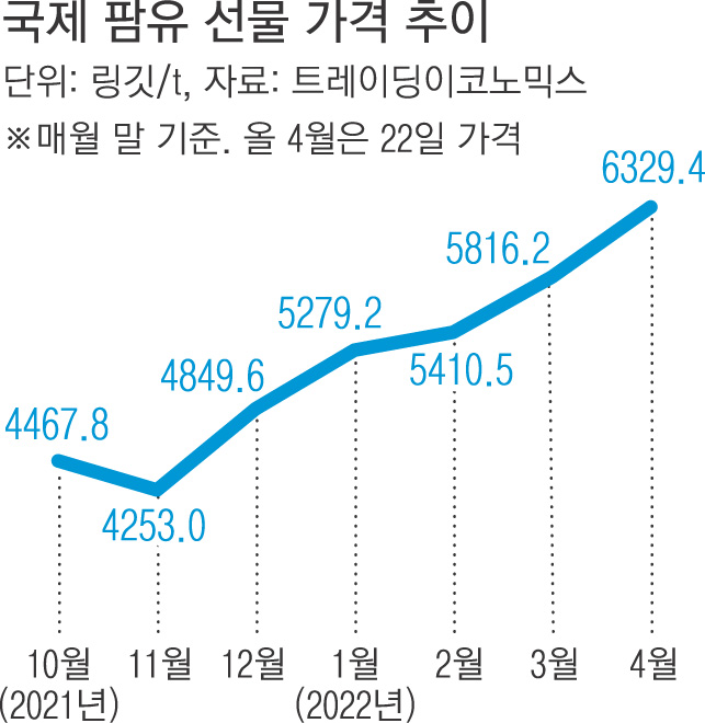 트레이딩이코노믹스 통계를 보면 팜유 선물 가격은 지난해 11월 말 t당 4253링깃(약 122만원) 수준이었으나 지난 22일 6330링깃(182만원)까지 올랐다.