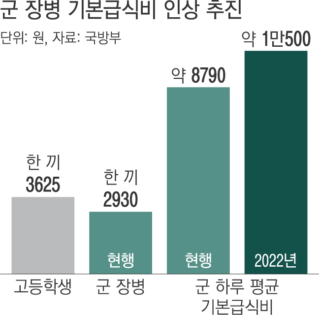 국방부가 현행 하루 8800원 수준의 장병 1인당 기본급식비를 내년부터 1만500원가량으로 약 20% 인상하는 방안을 추진한다.