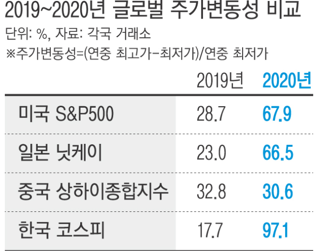 지난해 한국 주식시장이 주요국 증시에 비해 주가변동성이 특히 큰 것으로 나타나 투자자들의 주의가 필요하다는 의견이 제시됐다.