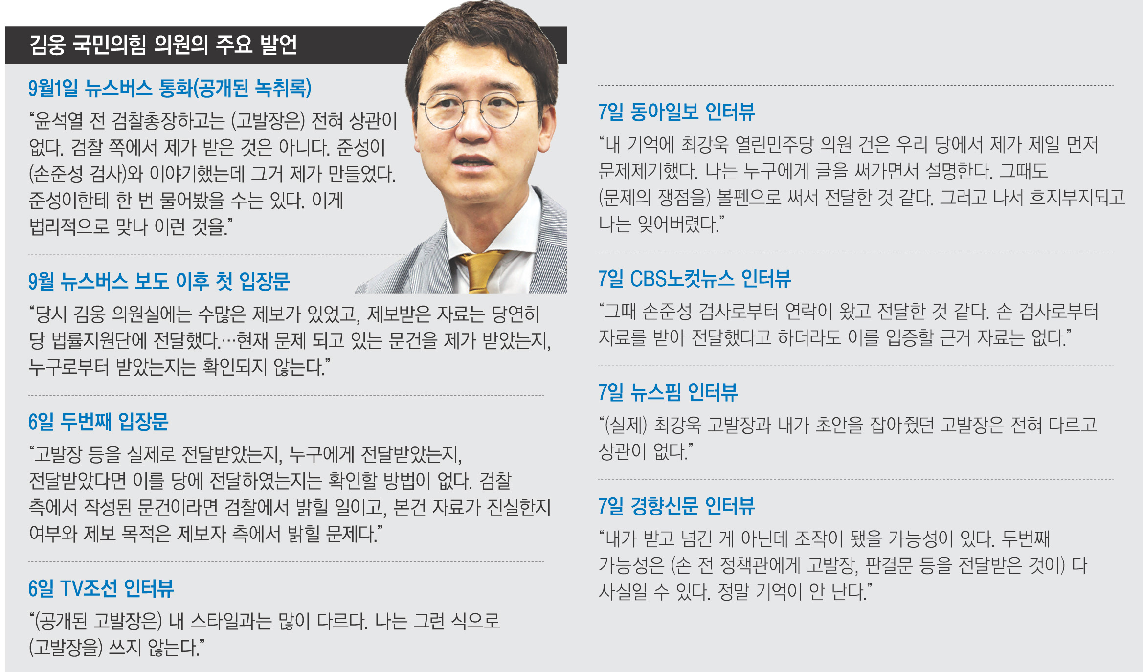 ‘고발 사주’ 의혹의 핵심 인물인 김웅 국민의힘 의원의 해명이 시시각각 바뀌고 있다.
