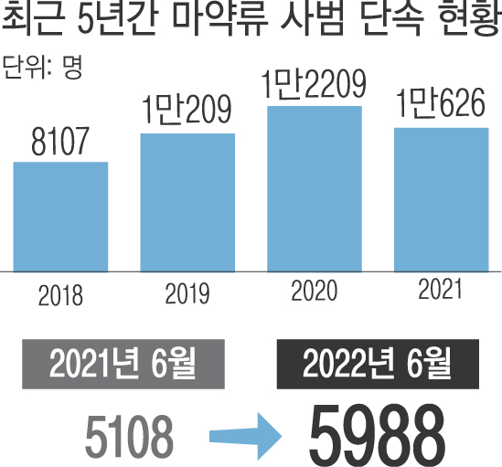 올해 상반기 검거한 마약사범은 5988명으로 지난해 같은 기간(5108명)보다 17.2% 증가했다.