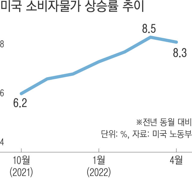 미국 노동부가 발표한 4월 소비자물가지수(CPI)는 전년 동월 대비 8.3% 올라 시장 예상치를 웃돌았다.