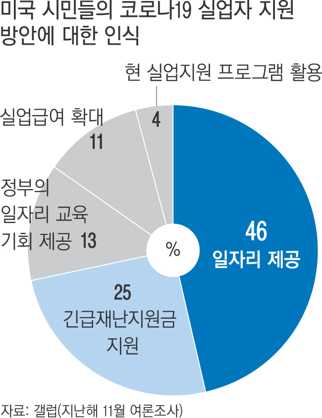 갤럽이 지난해 11월 발표한 여론조사에서 코로나19 기간 실직자에게 공공 일자리를 제공하는 방안에 대해 93%가 찬성했다.
