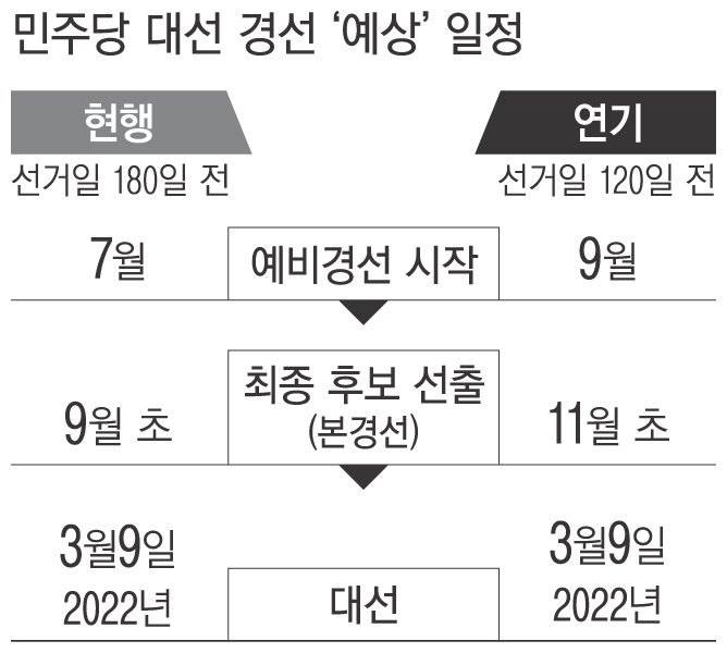 더불어민주당에서 ‘내년 대선 당 경선 연기 문제’가 소리 없이 뜨거워지고 있다.