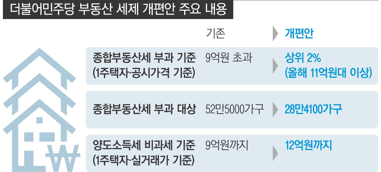 더불어민주당이 종합부동산세와 양도소득세를 완화하기로 당론을 정한 데 따른 시장 영향은 제한적일 것이라고 부동산 업계에선 전망한다.