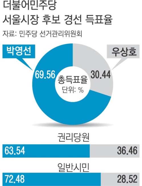 1일 민주당 서울시장 보궐선거 경선 결과는 ‘이변’ 없이 끝났다. 당원 표심과 일반 시민 투표 결과 모두 박 후보에게 몰리면서다. 박 후보는 총득표율 69.56%로, 권리당원(63.54%)과 일반시민(72.48%) 투표 모두에서 상대 후보인 우상호 후보를 앞섰다. 당 관계자들은 “당심과 민심 모두 ‘이기는 후보’를 선택한 것”이라고 분석했다. 박 후보는 최근까지 각종 여론조사에서 여권 서울시장 후보 지지율 1위 자리를 유지했다.