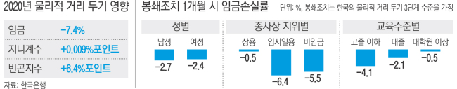 지난해 코로나19 확산과 물리적(사회적) 거리 두기 조치의 영향으로 임금은 최대 7%가량 줄고, 부익부 빈익빈이 심해지면서 지니계수와 빈곤지수는 상승한 것으로 분석됐다. 봉쇄조치를 시행했을 경우 저소득층, 임시·일용직, 고졸 이하 근로자의 임금손실률이 더 크다는 사실도 수치로 확인됐다.